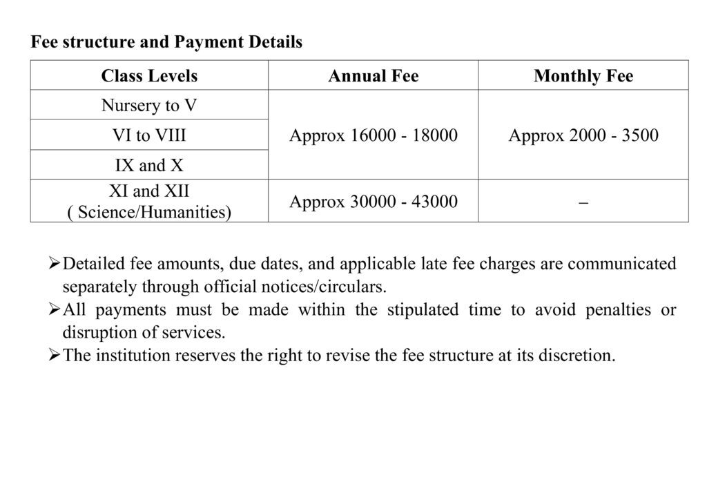 Admission Fee | One time only at the time of admission | Nursery – XII |
